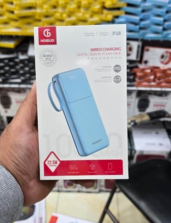 باور بنك HOGUO P18 – 10,000mAh بشحن سريع PD + QC، شاشة ديجيتال، و3 مخارج شحن. خفيف، سريع، ومناسب للاستخدام اليومي.