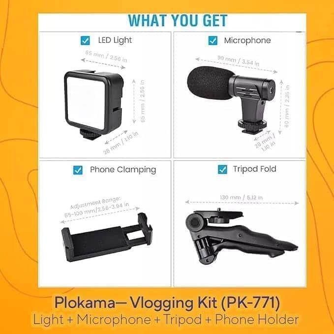 Plokama PK-771 (4 في 1) – ترايبود ومايك وكشاف LED وريموت
